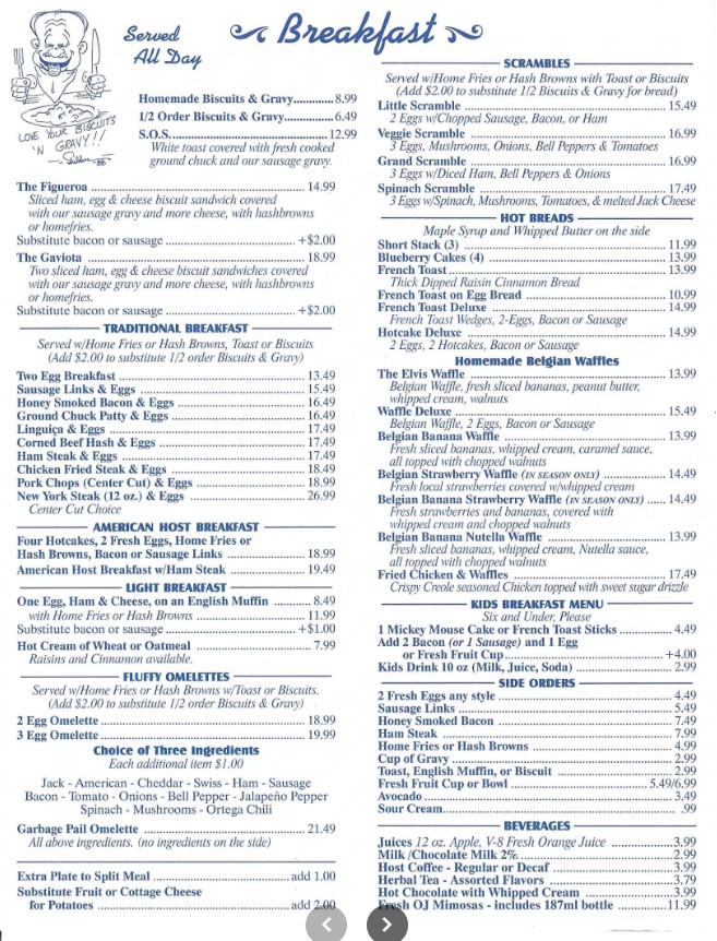 American Host Restaurant & Catering in Lompoc, California is a trusted local favorite known for its hearty meals and welcoming atmosphere. The American Host Restaurant & Catering Restaurant menu features a wide variety of classic American dishes, including breakfast specials, comfort food favorites, and satisfying lunch and dinner options. With a focus on quality ingredients, generous portions, and affordable pricing, this restaurant is ideal for families, casual dining, and catering events. Whether you’re starting your day with a delicious breakfast or enjoying a full meal, the menu offers something for everyone.